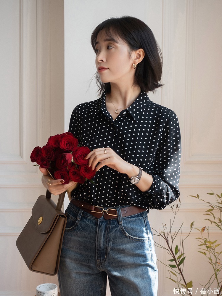 玄色的圆点衬衫,这种单品形貌上很显瘦,版型也相配的显细。况兼用来搭配牛仔裤立场亦然绰绰过剩。